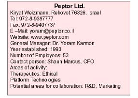 Peptor, founded by Yoram Karmon, PhD, now its president and CEO, employs 41 people at its R&D center in Rehovot